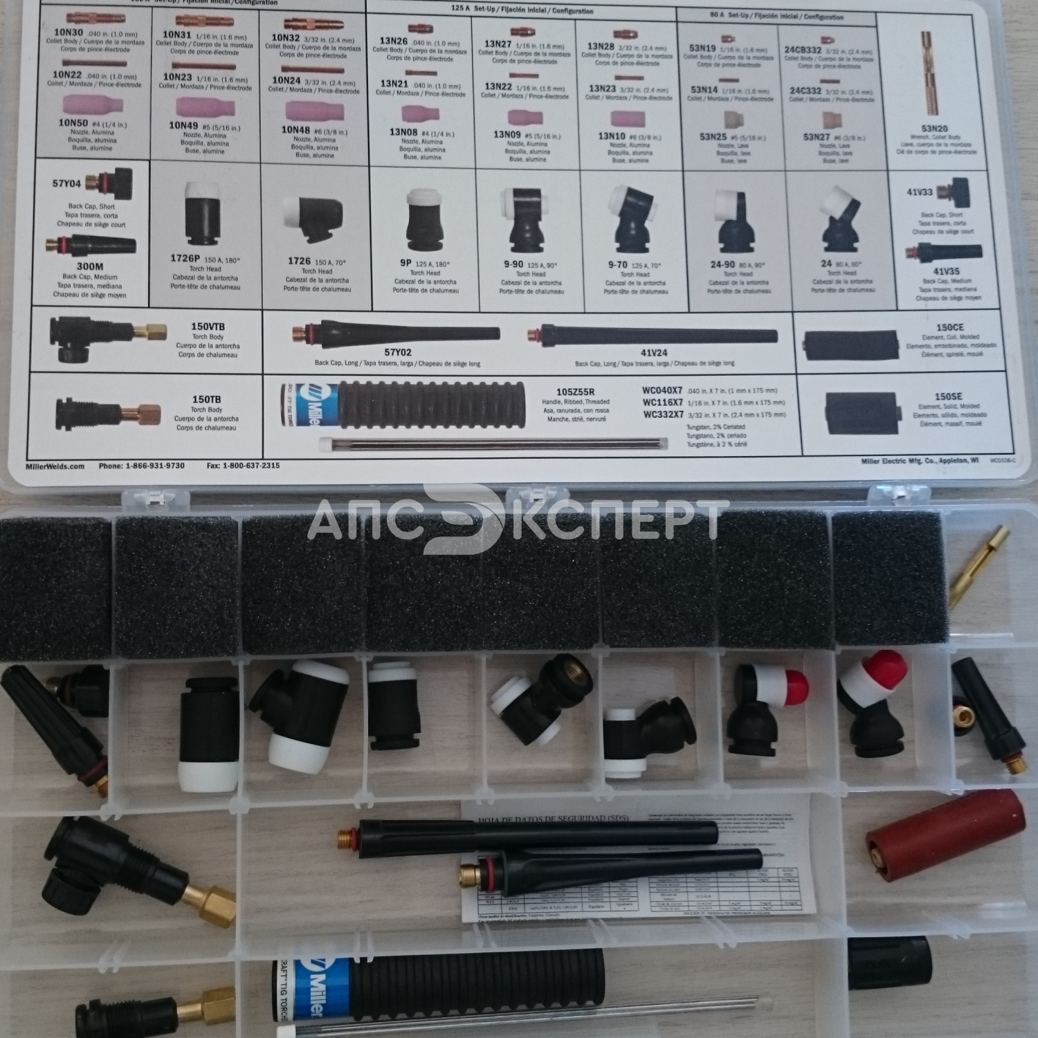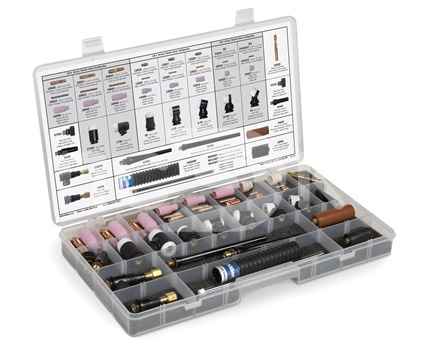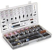 Набор головок для сварочных горелок AK-150MFC — комплексный комплект для сборки и обслуживания TIG-горелок с током до 150 А. Включает все компоненты для трех конфигураций: 80 А, 125 А и 150 А с разными углами наклона головки (60°, 70°, 90°, 180°).